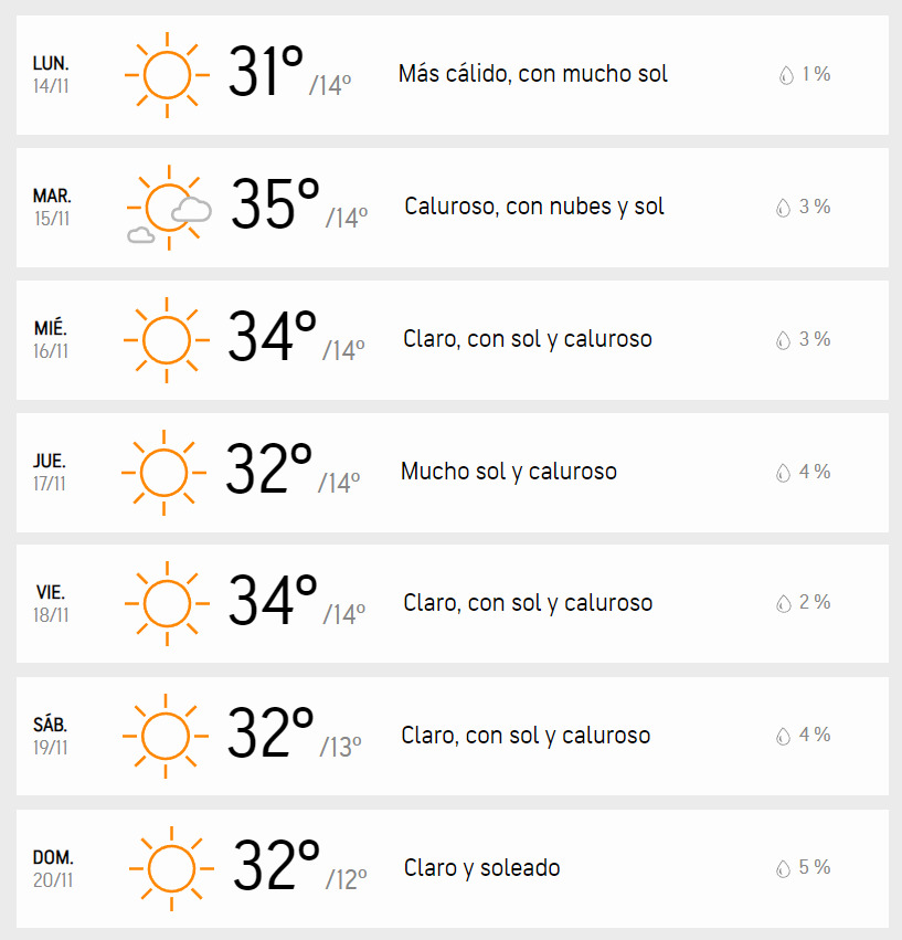 El día miércoles, dijo que los cielos «despejados con 30°C de máxima, mientras que el jueves (17) los termómetros llegarán a los 29°C». Mientras que el viernes 18 habría una temperatura similar, de 30°C. A continuación, de acuerdo al reporte de la plataforma Accuweather, te dejamos el pronóstico del tiempo para el resto de la semana, entre el lunes 14 y 20 de noviembre: