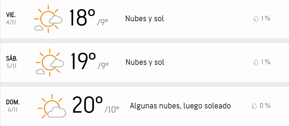 El viernes, las temperaturas llegarán a los 18 grados, el sábado a los 19 y finalmente el domingo, el termómetro llegaría hasta los 20 grados celsius.