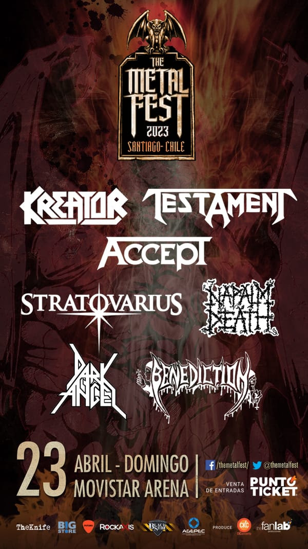 Estas agrupaciones son las últimas confirmadas para esta jornada que se realizará el 23 de abril de 2023, en el Movistar Arena y que tendrá como invitados a los internacionales Kreator, Testament -con Dave Lombardo en la batería-, Stratovarius y Benediction, además de los nacionales Torturer, RECRUCIDE, Cabrio, Undercroft, Devil Presley, Vilú y Enigma. Entradas disponibles en PuntoTicket.