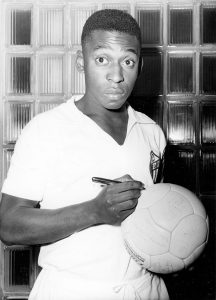 Un jóven Pelé con 17 años disputaba su primer mundial en Suecia 1958. En la fotografía se observa al brasileño y al portero sueco Kalle Svensson disputando un balón durante la final de ese mundial.