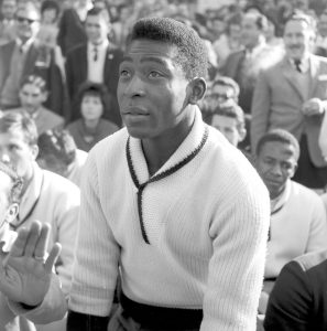 Pelé durante el mundial de Chile en 1962 solamente disputó dos partidos, ya que se lesionó en la fase de grupos. En la imagen, Edson Arantes do Nascimento observa el partido de Chile vs Yugoslavia compitiendo por el tercer lugar, partido que terminó ganando Chile por 1 a 0.