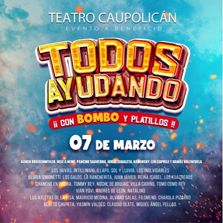 Bombo Fica creó el evento a beneficio llamado “¡TODOS AYUDANDO CON BOMBO Y PLATILLOS!”, un espectáculo imperdible donde varias figuras de la música, humor y espectáculo se juntan para colaborar con esta noble causa y ayudar a las personas afectadas por los incendios ocurridos en el sur del país. El evento se realizará el próximo martes 7 de marzo, a las 17:00 horas, en el Teatro Caupolicán. Toda recaudación irá en ayuda a los damnificados.
