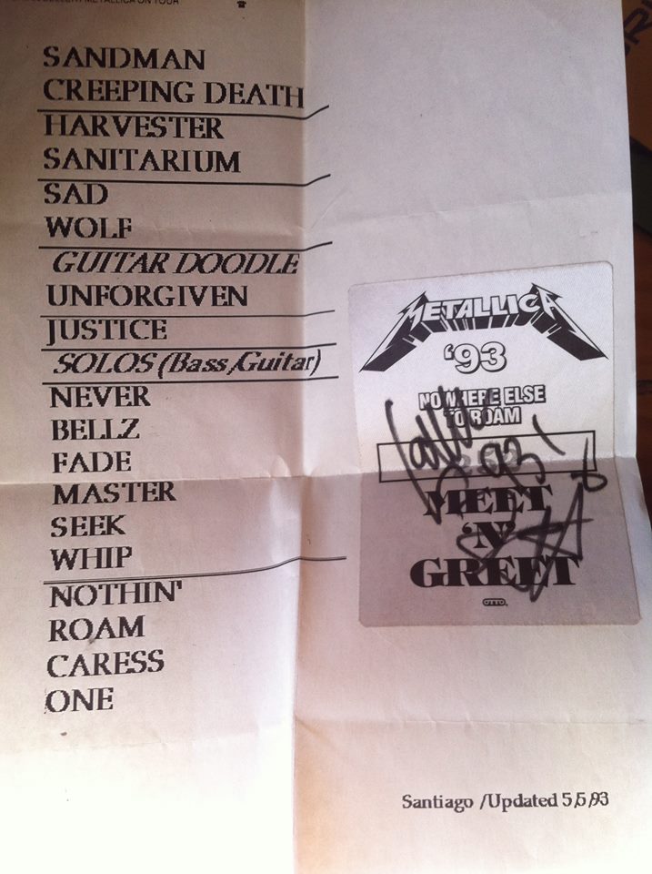 «El ’93 trabajaba en la recién nacida Rock&Pop pero no alcancé credencial. Fui personalmente a Providencia Televisión a rogar por una y me fue bien. Marcelo Aldunate me regaló su meet&greet y pude fotografiarme con todos menos Jason que no apareció. Le pregunté a Lars si tocarían “Stone Cold Crazy” de Queen, versión que sonaba mucho por esos días y me respondió con su particular estilo: «mira, no está en el set list de esta noche pero si el público se lo gana podemos hacer una excepción ya que para nosotros la audiencia lo es todo…» Al final del show, después de «One» mientras los chicos se despedían, Lars corre a decirles «One More, One More!!!». Luego de un rato tocan STONE COLD CRAZY. No lo podía creer. En el video del concierto se aprecia esto último».