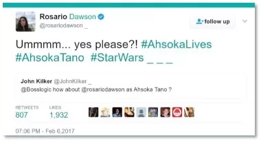 Para eso, los realizadores escucharon el pedido proveniente del lugar menos pensado: Twitter. En febrero de 2017, Dawson respondió con entusiasmo un tuit de un fan que la candidateó para interpretar el personaje. La idea se expandió rápidamente entre el fandom, que LucasFilm convocó a Rosario.