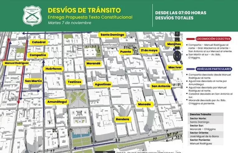 “Estos contemplan unos desvíos de la línea Compañía de Jesús. Los cuales van a estar en Manuel Rodríguez para que la locomoción colectiva pueda continuar por esta arteria, subir por General Mackenna hasta San Antonio, retomar en Merced y ahí proseguir su recorrido habitual”, agregó.