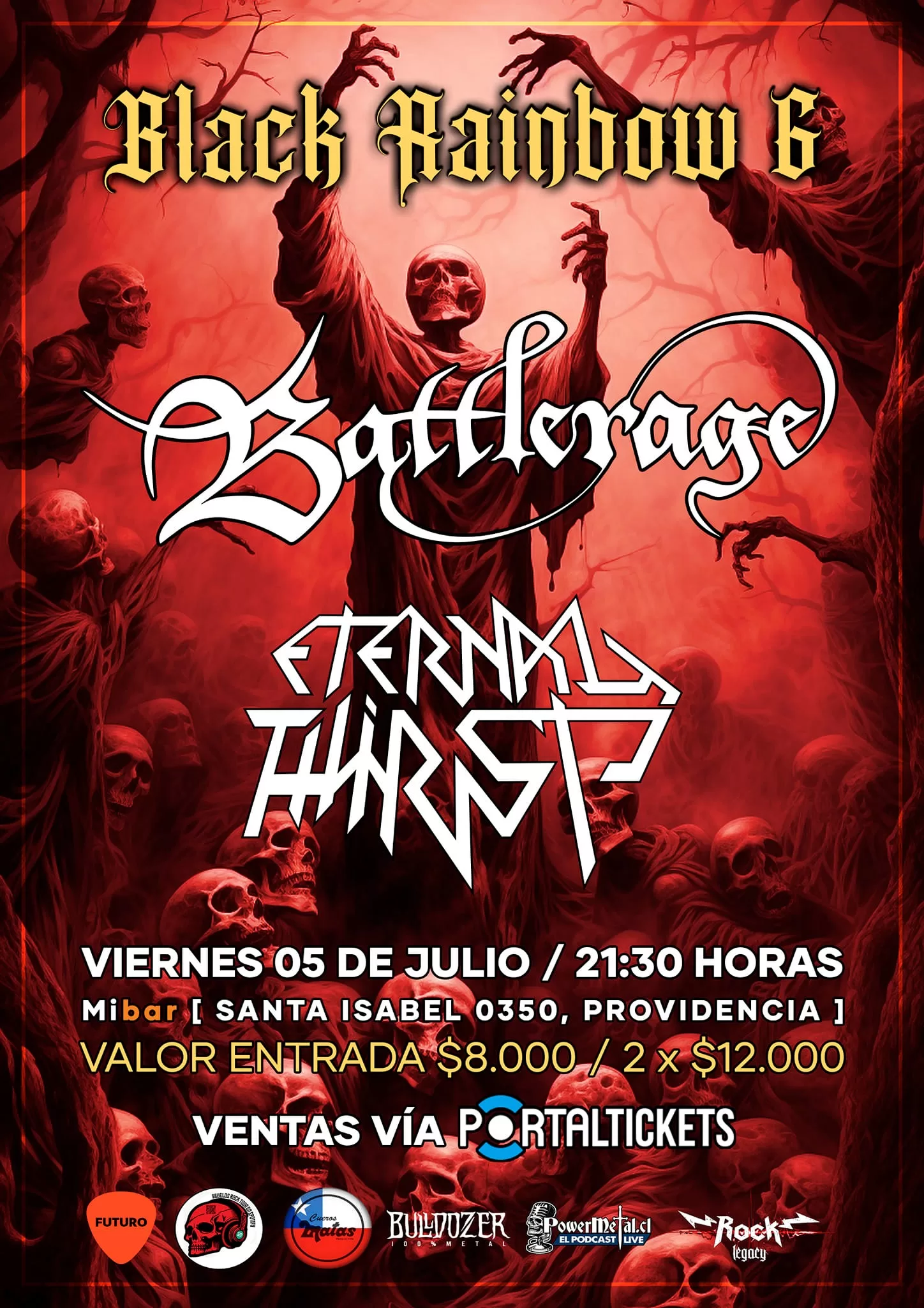 La actividad de música en vivo no se detiene para el heavy metal nacional y así lo puede atestiguar Battlerage, una banda que ha estado especialmente activa este año y se aproxima una nueva batalla en vivo: el 5 de julio junto a sus colegas de Eternal Thirst en el evento Black Rainbow 6 en MiBar, de Av. Santa Isabel con Av. Condell, en Providencia.