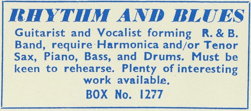 En mayo de 1962, Brian Jones publicó un anuncio en Jazz News para cualquiera que quisiera unirse a él en una nueva banda de rhythm and blues que estaba formando. Jagger, que había conocido a Jones en el Ealing un mes antes, vio el anuncio y se llevó a su compañero Keith Richards a la audición en el pub Bricklayer Arms en Broadwick Street en Soho. Claramente, los tres hombres tenían química y después de la incorporación de Stewart, Dick Taylor (que formó Pretty Things) en el bajo y Mick Avory (que pronto se uniría a los Kinks) en la batería, se formó la banda.
