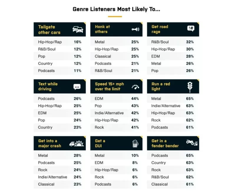La empresa encuestó a 1.000 conductores estadounidenses para ver cómo sus hábitos de escuchar música afectan su manera de conducir y, como era de esperar, la agresividad de la música pareció desencadenar algunos malos hábitos de conducción.