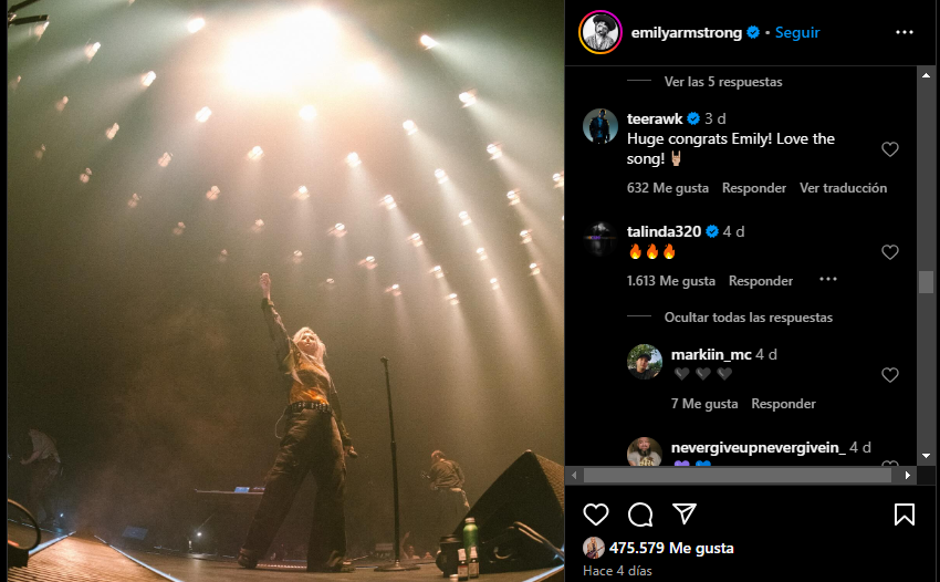 En septiembre pasado, Emily Armstrong compartió una publicación en Instagram agradeciendo el apoyo tras conocerse la noticia de que sería la nueva vocalista de Linkin Park, que recibió como comentario tres sutiles emojis de Talinda Ann Bentley.