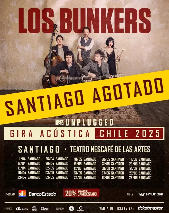 Los Bunkers, la banda más importante y convocante del país, anuncia el sold out de sus 25 fechas en Santiago de su exitosa “Gira Acústica 2025″. La residencia que comenzó el 11 de abril en el Teatro Nescafé de las Artes ha cosechado elogios tanto del público como de la prensa, catalogado como uno de los mejores shows de este año.