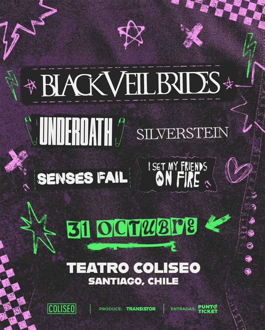 Black Veil Brides, Underøath, Silverstein, Senses Fail y I Set My Friends On Fire llegarán a Chile en medio de su gira por la región, que desde su anuncio en países vecinos se ha transformado en una de las citas más pedidas por los fanáticos chilenos. Ahora, tendremos la oportunidad de disfrutar de estas 5 bandas en una misma tarde. Todas presentando su propio show en una jornada maratónica de la que no te puedes quedar fuera.