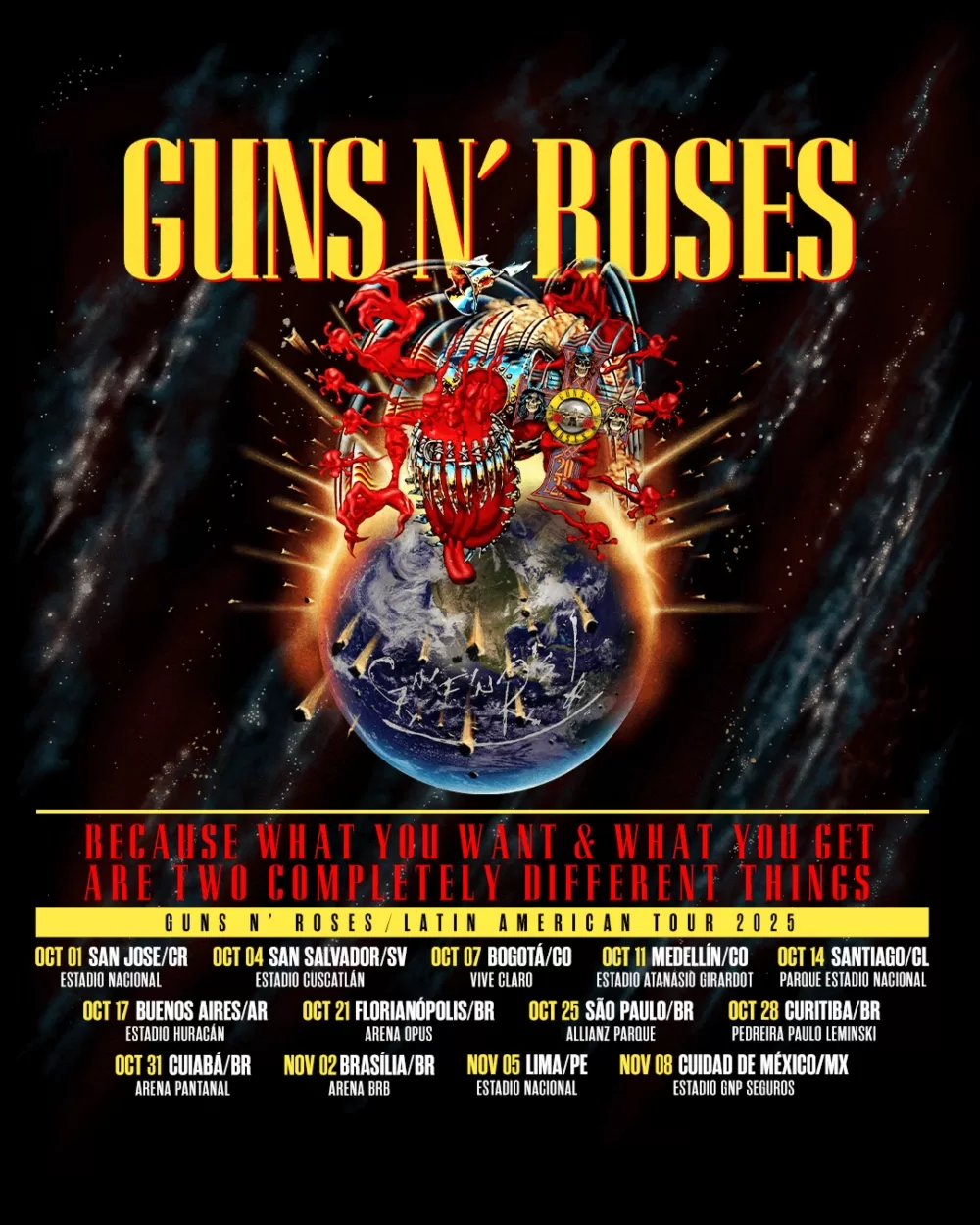 A nuestro país, Guns N’ Roses llegará de la mano de su Tour Mundial, “Because what you want N’ what you get are two completely different things”, el que comenzó a principios de mayo en Corea del Sur, para luego recorrer las principales ciudades de Asia, Europa y finalmente América. Esta gira, los tendrá por primera vez tocando ante el público de Arabia Saudita, Georgia, Lituania y Luxemburgo.